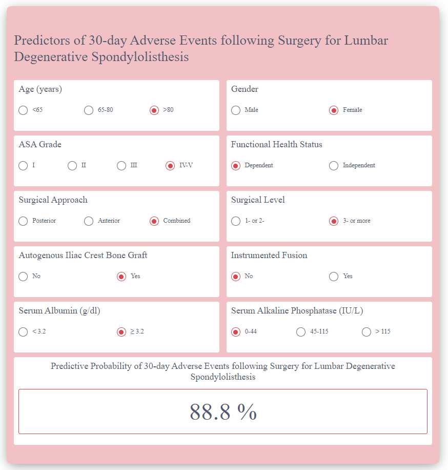 Calculating Adverse Events following Surgery for DS: Fatima N et al 2020 16 recently developed a machine learning algorithm from large datasets based on multiple predictors for lumbar DS. This calculator provides predictive probability of the adverse events following surgery for patients with DS.