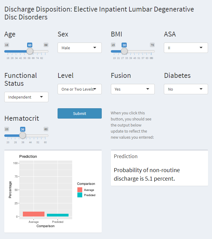 Calculating Discharge Disposition following Surgery for DS: In 2019, Karhade AV et al 17 developed a calculator using machine learning algorithms that can accurately predict discharge in patients undergoing elective surgery for DS.