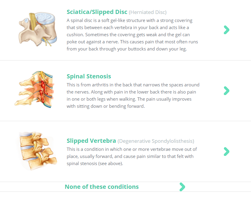 Calculating Estimates of Personalized Treatment Outcomes: Moulton et al’s18 calculator, released in 2018, provides outcome prediction regarding the treatment of three back problems: slipped disc/sciatica, spinal stenosis, and slipped vertebrae.