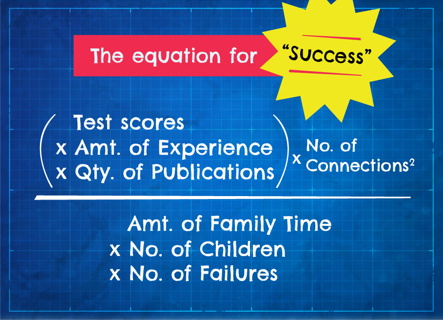 This algorithm shows that the rate of “success” is directly proportional to test scores, amount of experience, and quantity of publications, as well as being exponentially related to number of connections. This ultimately comes at the cost of time spent with family and children.