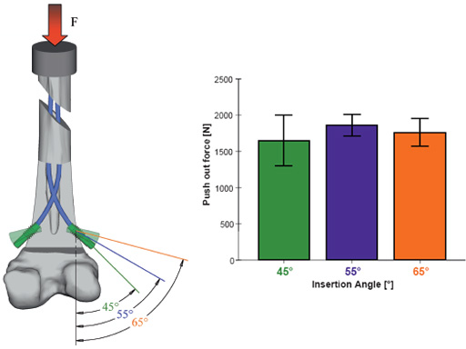Elastic Stable Intramedullary Nailing (ESIN) is a common method for treatment of pediatric femoral shaft fractures. Backing out of the nails at the insertion sites is a potential problem in unstable fractures of older children. To overcome this problem End Caps may be placed over the nail ends and screwed into the bone (see also page 16). This in vitro study investigated two aspects: (a) The effect of the End Cap insertion angle upon the End Cap push-out force and (b) the potential advantage of using End Caps with regard to backing out of the nails.