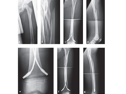 Results 8 girls and 26 boys with a mean age of 105 38 months (range 415 years) were treated with ESIN and end caps. Nails of 2.54 mm diameter were used (2.5 mm: 1 case; 3.0 mm: 19 cases; 3.5 mm: 10 cases; 4.0 mm: 4 cases). There were 18 spiral fractures, 11 oblique fractures, 3 transverse fractures, and 1 pathological fracture. 32 fractures were nailed in a retrograde direction, 1 was nailed antegrade, and 1 was nailed with one antegrade and one retrograde nail. The majority of fractures extending from the proximal to the middle third of the femur shaft, only three fractures affected the distal third of the femur. A third fragment was found in 7, multiple fragments were present in 2 children. All fractures were stabilized sufficiently with ESIN and end caps, in 1 patient one end cap was loose and thus not functional. Loss of reduction was observed in none of the patients. Leg-length difference > 1 cm resulted in none of the patients at the last available follow-up. Varus/valgus deformity of 10 resulted in 1 patient after an additional trauma, an axial angulation <10 was seen in 3 patients postoperatively. The mean interval between operation and removal of the implants was 5.6 months. Removal of the end caps and nails was rated simple and uncomplicated in all cases (28/34 removed so far).