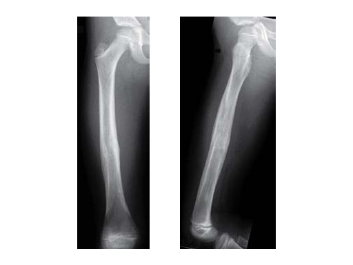 X-rays show a long spiral fracture of the proximal third of the right femur (32D/5.1). Because of the age good indication for ESIN, but some danger of instability is possible.