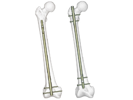 A newly designed instrument set permits a more percutaneous technique and less tissue stripping. Compared to the Distal Femoral Nail (DFN), the R/AFN offers additional locking options, allowing also an antegrade approach.