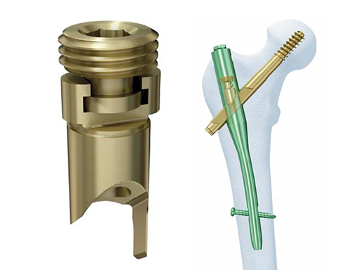 Some surgeons like the option of preventing sliding of the TFN helical blade or screw in certain situations, such as, reconstructive procedures, gun shot injuries, reverse obliquity fractures, and tumors. In order to prevent collapse of the head element, the TFN Set Screw (Fig a) was developed. Once the set screw is tightened with a torque limiting handle, the grooves on the underside of the TFN Set Screw engage with the helical blade or screw to prevent sliding. It is available in 3 angles (125, 130 and 135) in order to match the CCD angle of the nails, and is made of TAN (alloy).