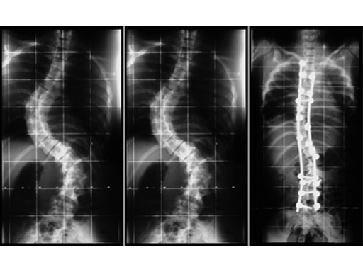 16-year-old woman with progressive kyphoscoliosis (scoliotic double curve: preoperative thoracic 78 and lumbar 68; postoperative 38 and 30); posterior instrumentation with pedicle screws in L1 to L5 and pedicle, lamina and transverse process hooks in T2 to T10 after anterior release.