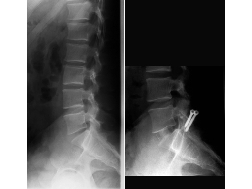 31-year-old man, lateral, pre- and postoperative x-rays.