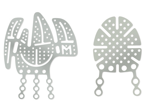 An updated, solid style orbit plate was also required in order to provide users with adequate choices for orbit reconstruction. As in the case of the mesh plate, the anatomical plates are designed to minimize trimming and to facilitate shaping for fitting into the orbit area. The large plates have a large medial wing, identified by an M-shaped cutout, and a smaller lateral wing. The small plates are circular in design with cut out reliefs for contouring.