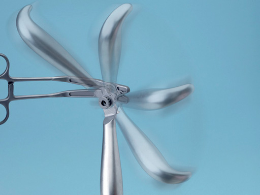 The Basic Trocar Handle can rotate around the cannula to allow for more space at the operating site. To maintain control over the instrument, the handle engages like a ratchet in discrete arcs instead of freely rotating.