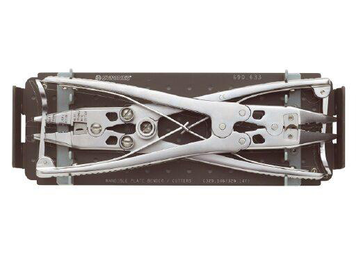 Currently over seven instruments are available to either cut or bend plates. Hence they have to be combined with instruments that perform the other function. This adds to the size and complexity of instrument sets. The mandible plate bender/Cutter set is intended to offer the functionality of benders and cutters in one instrument set. The instruments are offered in one compact, organized insert tray, and allow for performance of the following functions:
