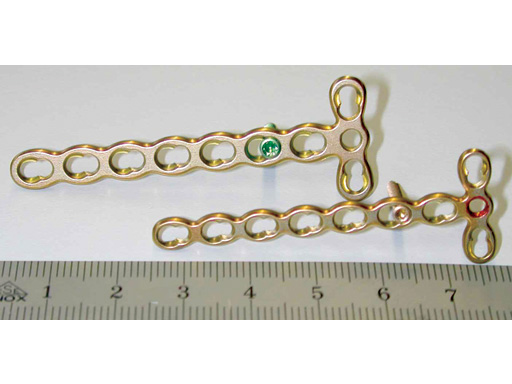 The Small Interlocking T-Plate is part of the Compact Hand Set and available in the dimensions 2.0mm and 2.4mm. Indications for the use of this plate are fractures of larger bones in the hand, fractures of the distal radius, ulna or fractures in the foot. Both plates are designed as T-plates. The plate holes allow either excentric drilling to achieve compression or the use of angle stable screws. The main advantage of the angle stable implants is stability against secondary redislocation, when there is no stable buttressing of the fragments under the plate or in the opposite cortex because of comminution or osteoporosis. This is often the case in extra- or intraarticular fractures of the base of the first metacarpal or fractures of the distal radius.