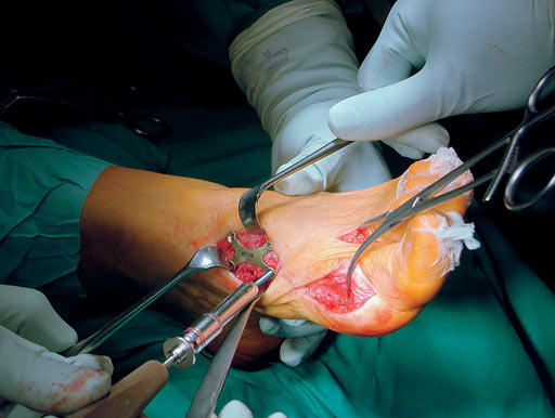 Post traumatic arthritis, rheumatoid arthritis, and neurological disorders can cause severe deformities such as cavus foot, equinovarus, telipes, and planovalgus. Treatment of these deformities by an osteotomy or a fusion of one or several joints bears the risk of screw breakage due to high shear forces. Other disadvantages are long healing and rehabilitation time. Metatarsophalangeal arthroplasty may leave a large defect if it fails.