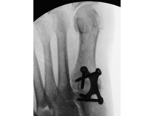 The Locking X-Plate 2.7 was developed to treat these deformities of the foot by a rigid fixation construct with high primary stability. It is a stand alone implant in osteotomies and serves as a neutralization plate in arthrodesis of foot joints in combination with one or two compression screws. Primary indications are first metatarso cuneiform fusions, proximal first metatarsal osteotomies (crescentic, open wedge, Mann, Ludloff, and proximal Chevron) and first metatarso phalangeal fusions.
