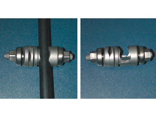 Tube and rods are available in steel and/or carbon fiber. The Schanz screws are self-tapping or self-drilling in steel and titanium. All clamps will be open and snap on. The clamps will be colour coded for each size. The standard frame is the 3 Tube Modular Technique.
