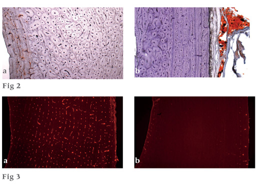 Blood samples from the RIA side contained significantly less fat than the samples from the UR side (Fig 1b). After irrigation and suction little fat was observed in the cortex of RIA specimens, whereas after unreamed nailing the endosteal third of the cortical bone was infused with fat (Fig 2). Unreamed nailing acutely showed signs of remaining perfusion in the endosteal tenth and periosteal third of the cortical bone, after irrigation and suction-reaming perfusion was preserved to a lesser degree due to ablation (Fig 3). After ten weeks callus development and perfusion was similar in both groups. Cortical remodelling was the same in both groups after four weeks and was three times larger in the unreamed group after six weeks, indicating a more pronounced reaction to intracortical damage.