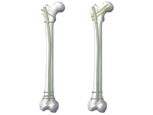 Intramedullary nailing is considered the method of choice in the treatment of femoral head and shaft fractures. Various nail implants are available for the management of these particular fractures. More recently, the lateral femoral nail (LFN) has been developed as part of the EXPERT nail family which offers an antegrade femoral nail with a unique anatomical bend for lateral entry point. The LFN is made with a different production technology, allowing for bending radii in two planes over portions of the nail. With an antecurvature of 1000 mm, LFN differs from other nails that have antecurvature characteristics of 1500 mm in the sagittal plane.