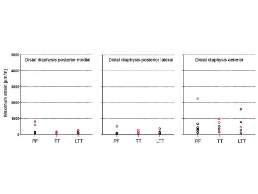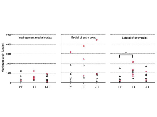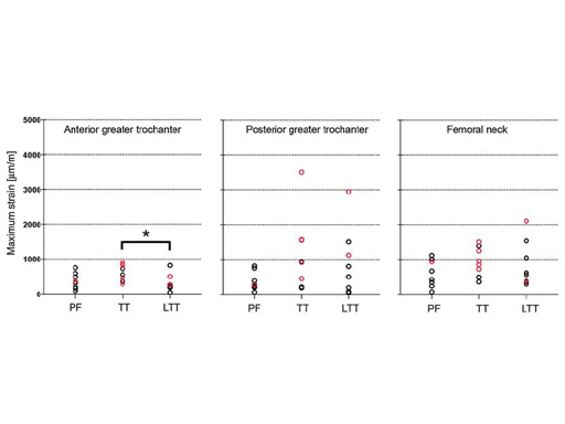 Three groups of eight cadaveric femurs were instrumented using following nail systems and entry points: cannulated femoral nail, piriform fossa (PF); antegrade femoral nail, trochanteric tip (TT); helical nail (prototype of the LFN), lateral of the trochanteric tip (LTT). During insertion the maximum principal bone strains were recorded at nine locations at the proximal femur and the diaphysis (Fig 1). The occurrence of iatrogenic fissures was documented.