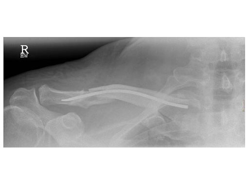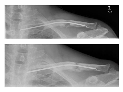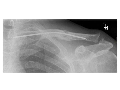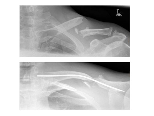 Use of the Titanium Elastic Nail (TEN) in displaced clavicle fractures offers a means of minimally invasive fixation that allows for early motion and function, immediate pain reduction and a lower rate of fracture non-union and malunion compared to non operative treatments. The risks of infection and non-union often associated with open reduction and internal plate fixation can be minimized by a percutaneous procedure (Keener). A study by Rehm reported on 136 fractures in 132 patients treated with the TEN with 78 placed entirely percutaneously, and the remaining required a limited exposure for fracture reduction. All but one healed, with follow-up revealing outstanding functional results.