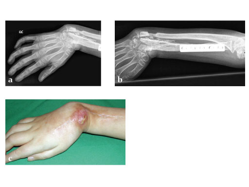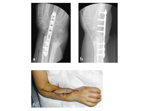 Fig 3b: Proximal osteosynthesis with two screws and arthrodesis of wrist wrist with LCP 2.7.