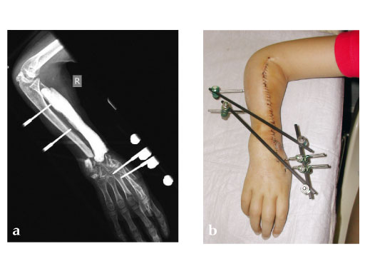 Fig 2ab: Resection of necrotic radius, temporary ExFix and pallacos spacer.