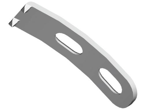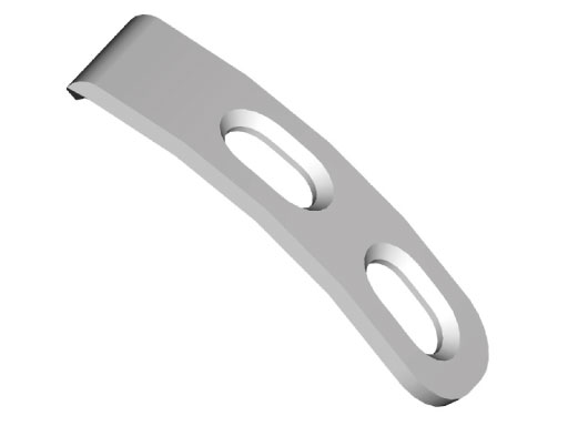 The plate is 11?mm wide by 3.3?mm thick and has four 2?mm length spikes. It has a 30 prebend between the 2nd and 3rd hole of the plate. At the topside of the bend is a threaded hole to accept screws with a