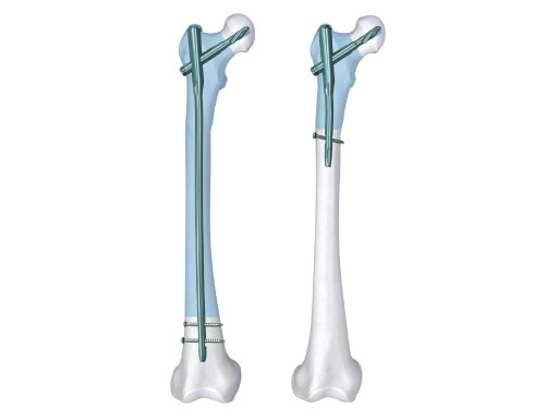 The PFNA Asian size is indicated for pertrochanteric fractures (Müller AO Classification 31-A1 and 31-A2), intertrochanteric fractures (31-A3), and high subtrochanteric fractures (32-A1). The long version is indicated for low and extended subtrochanteric fractures, ipsilateral trochanteric fractures, combination fractures in the proximal femur, and pathological fractures.