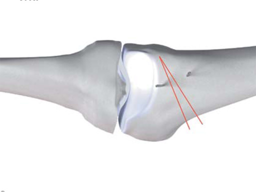 Distal femoral varus osteotomyThe goal of distal femoral varus osteotomy is to shift the mechanical leg axis from the lateral to the medial compartment. There are various possibilities for surgical correction of valgus malalignment. Open wedge lateral osteotomy or dome osteotomies of the distal femur have been widely used in recent years. Unfortunately, local complaints occurred in many cases mostly caused by the fixation methods (ie, frequent irritations of the iliotibial tract and loss of correction). Therefore new improved surgical technique based on an incomplete medial closing wedge osteotomy with an internal plate fixator was developed.
