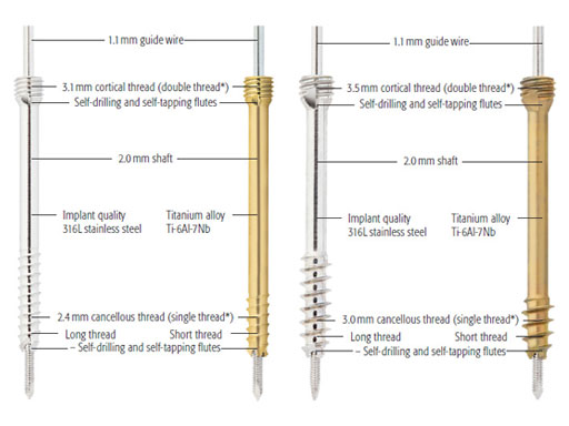The screws are available in different thread lengths. The 2.4 mm HCS has a short thread (940 mm length, 410 mm thread lengths) and a long thread (1740 mm lengths and 616 mm thread lengths). The 3.0 mm HCS comes in almost the same variety. This allows for optimal purchase in the far fragment for maximum compression and stability.