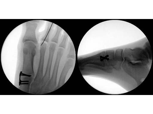 The locking X-plate 2.4/2.7 was developed to treat these deformities of the foot by a rigid fixation construct with high primary stability. It is a stand-alone implant in osteotomies and serves as a neutralization plate in arthrodesis of foot joints in combination with one or two compression screws. Primary indications are first metatarsal-cuneiform fusions, proximal first metatarsal osteotomies (crescentic, open wedge, Mann, Ludloff, and proximal Chevron), and first metatarsal-phalangeal fusions.