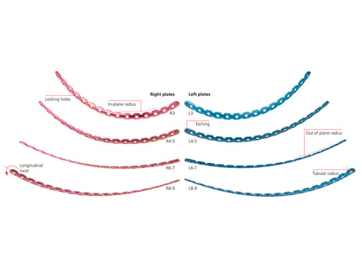 The MatrixRIB pre-contoured plates are available in sets of four (four left plates and four right plates, see Fig 2a) with designs that correspond to a specific rib or rib pair (Fig 2b). The plates, which cover fractures in all ribs suitable for plating, were designed to accommodate anatomic similarities between specific ribs.