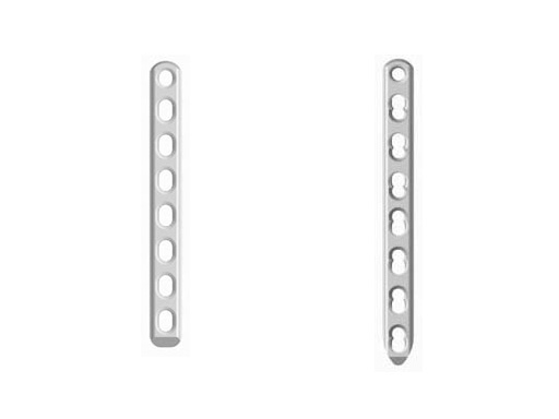 The mini LC-DCPs and LCPs utilize the standard LC-DCP and locked plate design with a few minor changes. The plates feature the standard toe nail design for MIPO at one end of the plate.