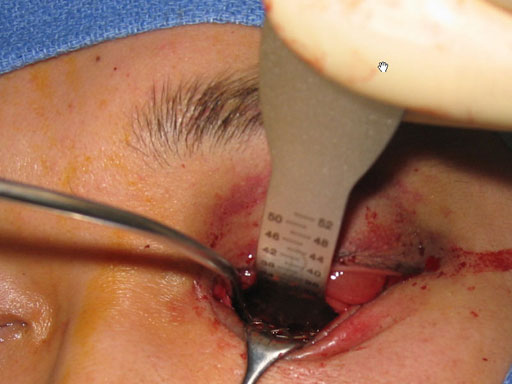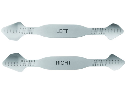 The retractor comes as a pair with one version for each side. Both are clearly marked as left and right and are also etched with a calibration scale on both sides that helps to estimate the anatomical situation in the patient's orbit. The retractor is made out of stainless steel, yet it is malleable. Each version has a large and a small end with the design following the orbital anatomy.