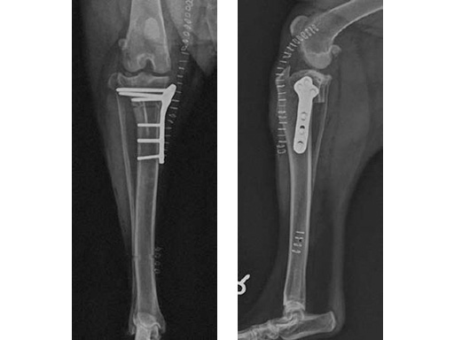 The tibia plateau leveling osteotomy (TPLO) procedure dynamically eliminates cranial tibial subluxation associated with cranial cruciate ligament (CCL) disease in the dog, and thereby stabilizes the knee joint during locomotion. CCL rupture in the dog is similar to ACL injury in humans.