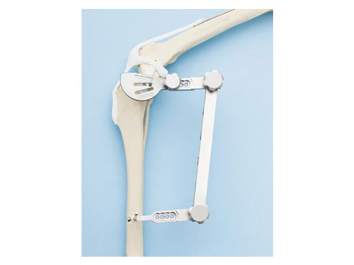 The jig and saw guides can be used bilaterally (for right or left tibiae). Specially designed hinge and saw guide screws within the jig resist loosening under vibration. The hardened steel jig pin screws resist stripping. The saw guides can be positioned in multiple positions along the jig and the jig arm position can be adjusted to allow for optimal placement of the osteotomy. The saw guides are available in three radii of 24 mm, 27 mm, and 30 mm to match the saw blade size selected for an individual patient. The instruments can be easily disassembled for cleaning, and are made of medical grade stainless steel.