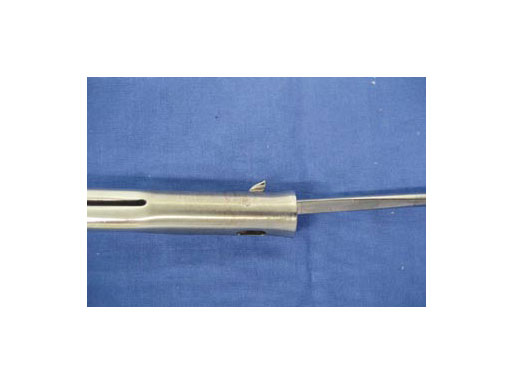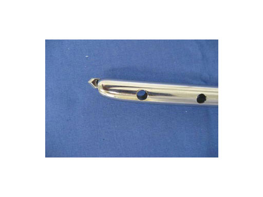 - If it is not possible to extract proximally, extraction hooks can be used; these hooks should be long and thin enough to reach through the entire nail as far as the tip, where they can be positioned (Fig 2). For this procedure, the entire canal must be cleared beforehand, using a hand drill. The extraction hooks have small tips. It is necessary to verify, using the image intensifier, that the hook is suspended on the tip. Then the hook pushes the nail in front of it.