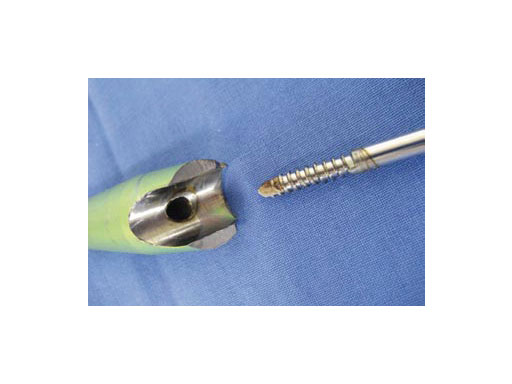 In every case, the objective must be to ensure that the Schanz screw (as long as possible) becomes embedded in the cannulation. A combination chuck or another suitable instrument must then be docked with the end of the long Schanz screw.