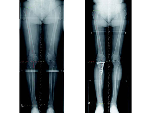 The correction is planned on a long-leg standing x-ray. After surgery, the mechanical axis should pass through a point 63% on the lateral side of the total width of the tibial plateau in the frontal plane. A transverse or slightly oblique incision is used to avoid damage to the saphenous nerve. The distal fibers of the medial collateral ligament are detached from the tibia. Under fluoroscopic control, two wires are placed in the proximal tibia marking the transverse osteotomy plane. The cut usually starts at the upper margin of the pes anserinus and ends at the tip of the fibula on the lateral side. The wires are placed exactly parallel to the tibial plateau thus taking into consideration the individual tibial slope of the patient. An incomplete cut of the posterior two-thirds of the proximal tibia is performed with an oscillating saw guided by the wires. Continuous irrigation avoids burn injury to the bone. A second osteotomy is now performed in the anterior third of the tibia in an angle of 100 ending above the patellar tendon insertion. A smaller saw blade is used and the complete anterior cortex is cut exactly in the frontal plane. The osteotomy is now gradually opened by inserting flat chisels or a spreader-chisel into the posterior osteotomy cleft. This process may take some minutes and can usually be completed without fracture of the lateral cortex. A bone spreader is now placed in the posteromedial edge of the tibia and the chisels are removed. The leg is extended and the correction is checked with the fluoroscope. A long metal rod is placed between center of the hip joint and center of the ankle joint. The projection of this rod should be at the planned point of correction on the tibial plateau lateral of the midline. Eccentric collapse of the medial joint space may cause accidental overcorrection. In this case pressure on the foot may simulate loading and body weight. The correction can be fine-tuned by opening or closing the spreader. The TomoFix Medial Tibia Plate is now placed in a subcutaneous pocket. The implant is precontoured and usually fits well to the bone surface. The distance holders avoid compression of the medial collateral ligament and the pes anserinus. Three proximal bolts are placed near the subchondral sclerosis zone. The position of the bolts is adapted to the anatomy of the proximal tibia giving optimum purchase for the bolts. An oblique lag screw is inserted distal to the osteotomy. This screw in the first combination hole allows careful compression of the lateral osteotomy hinge and pretensioning of the implant. A stab incision is created on the shaft and the implant is fixed monocortically with bolts. The lag screw and the distance holders are replaced by bolts. The medial collateral ligament is released longitudinally to reduce medial compartment pressure and the wound is closed in layers. An overflow drain may be used. Clinical and experimental work has proven that when this technique is closely followed, corrections up to and over 15 mm can be performed without bone grafting or use of bone substitutes.