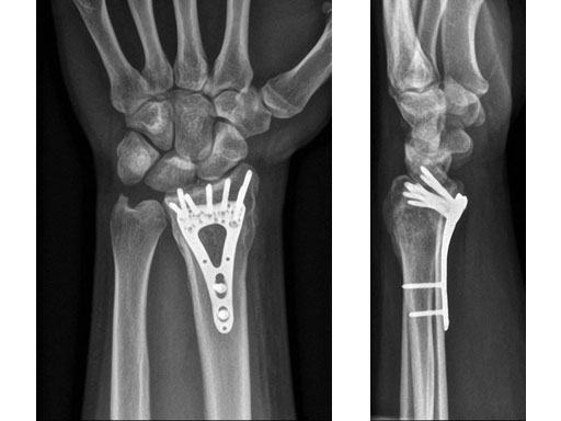 Fig 2 Stabilization of the radiocarpal articular surface with one single 2.4 mm screw at the level of the watershed line, and narrow plate below the watershed line.