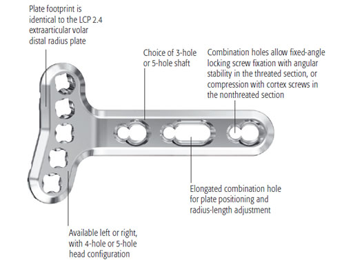 The is plate is part of the Variable Angle LCP Distal Radius System 2.4 (please see separate article) which is indicated for fixation of complex extraarticular fractures and osteotomies of the distal radius and other small bones.