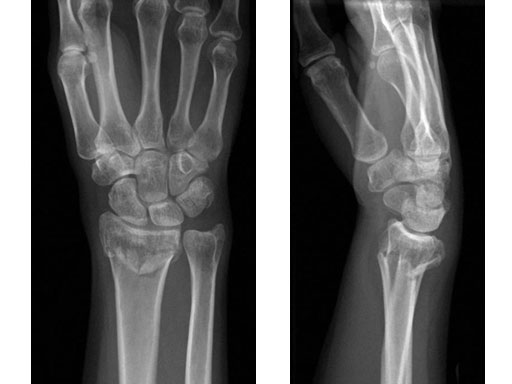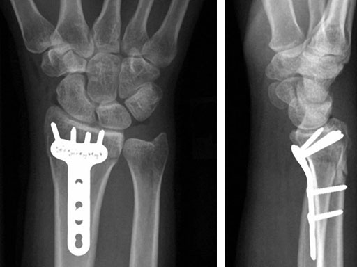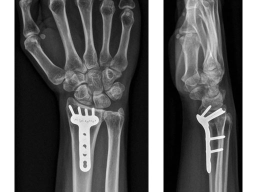 The new plate design is based on the existing LCP volar extraarticular distal radius 2.4. In total, eight plates are available, left and right, either 4-hole or 5-hole head option, and 3- and 5-hole shaft versions (see also case below).