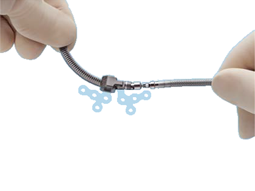 A functional stop is created by a track crimp to avoid undesired device disassembling (Fig 5). The distractor is made of titanium molybdenum, is for single use only, and has left and right assemblies available in different radii of curvature (30 mm, 40 mm, 50 mm, 70 mm, and 100 mm), as well as a straight version.