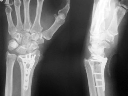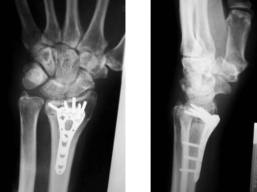 Fig 2 Stabilization of the radiocarpal articular surface with one single 2.4 mm screw at the level of the watershed line, and narrow plate below the watershed line.