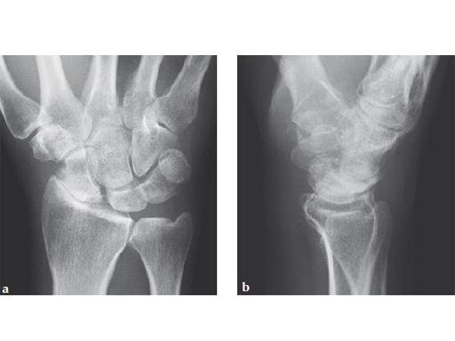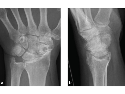 Fig 1ab Preoperative x-rays. Notice the midcarpal joint destruction and the DISI deformity of the lunate.