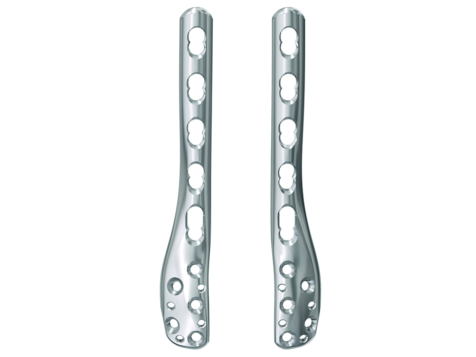 The plate has an anatomically precontoured head and a low-profile design. It comes in right and left versions with lengths from 3 holes (73 mm) up to 15 holes (229 mm) and is available in stainless steel.