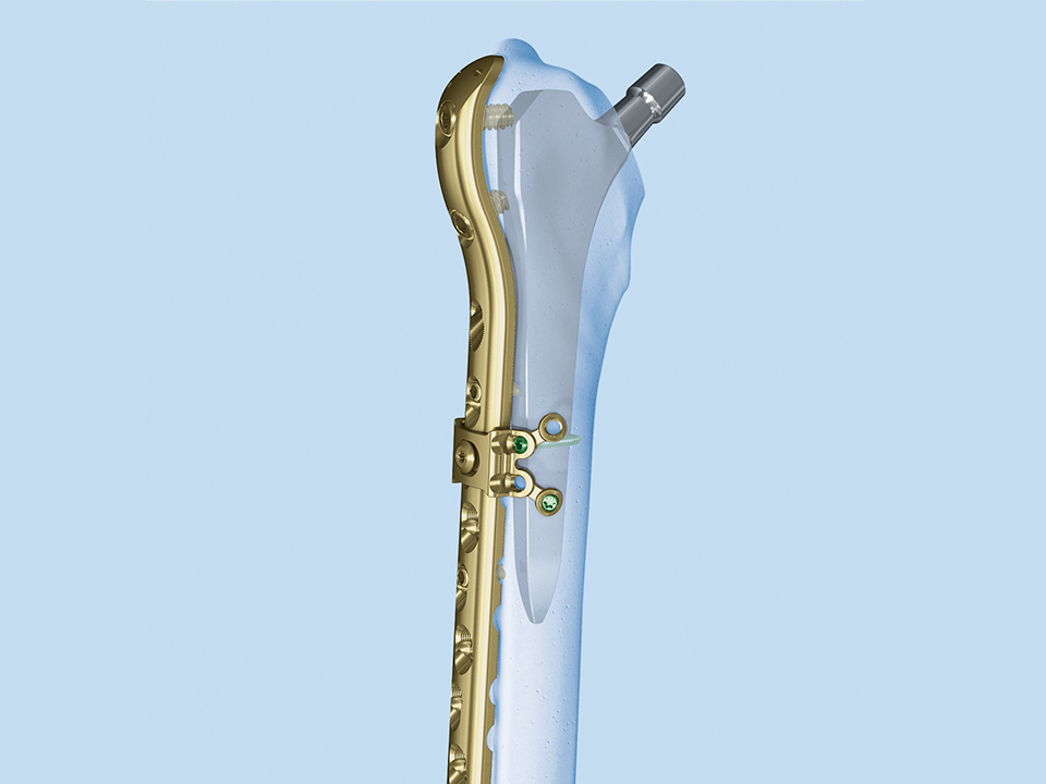 Periprosthetic fractures are increasing because of the aging of the population, more active old people, the development of endoprosthetics and an increase in the number of patients with long-standing implants. The incidence has been reported to be 1.5% for primary procedures and 4% for revisions [1]. Because of the prosthesis stem (or a nail) in the intramedullary canal it is not possible to insert screws bicortically as it would be needed. These fractures are mainly treated with cable systems and monocortical screws with the disadvantage of high invasiveness and the possibility of cutting into osteoporotic bone.