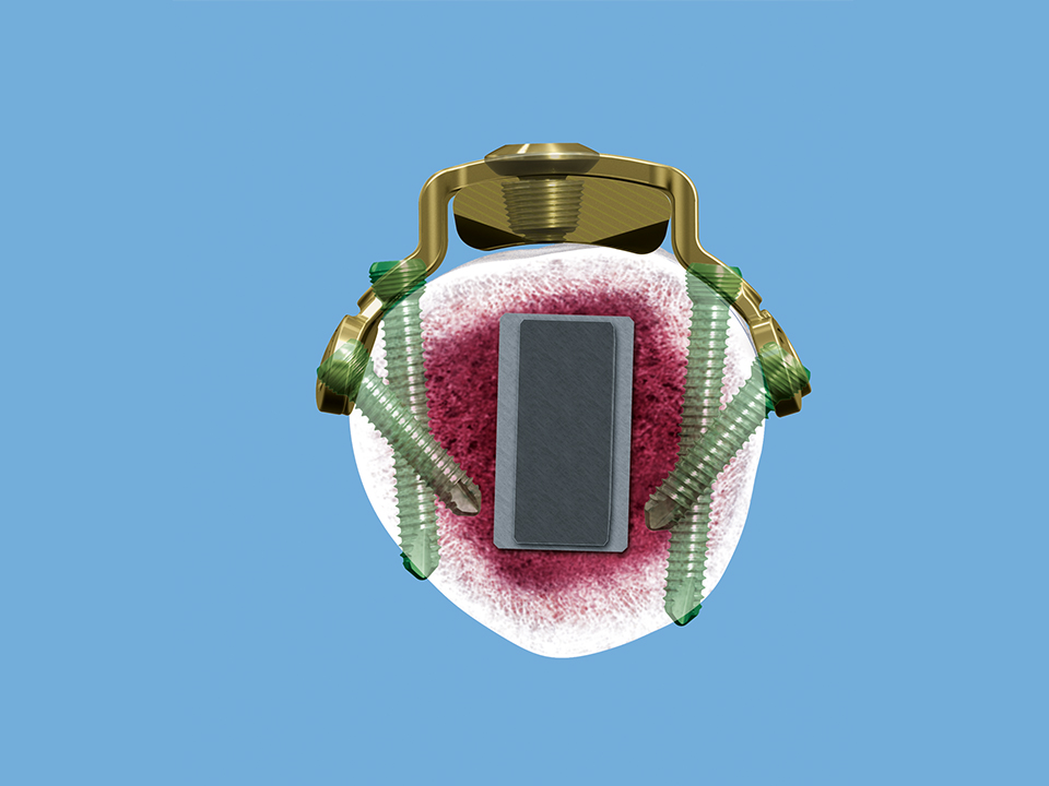 The plate is simple to use and the decision can be made intraoperatively (implants are available, both nonsterile and sterile packed). The threaded insert portion of the connecting screw is inserted into the base plate. Then the plate is placed on top and locked with the upper portion of the connecting screw.