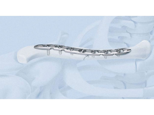 The existing 3.5 mm LCP superior anterior clavicle was designed to fit on the superior end laterally and twist midshaft to fit anteriorly on the medial aspect. The new 3.5 mm LCP superior clavicle plate design has removed the twist in the plate. A lateral bow was put in the plate to enhance plate fit. The flat superior design allows more flexibility in placement. A K-wire hole was added to the distal end of the plate as a plate holder. Notches in the plate facilitate easier contouring that may be required in some cases. Diverging and cross-hatching screw pattern in the lateral end increase fixation strength.