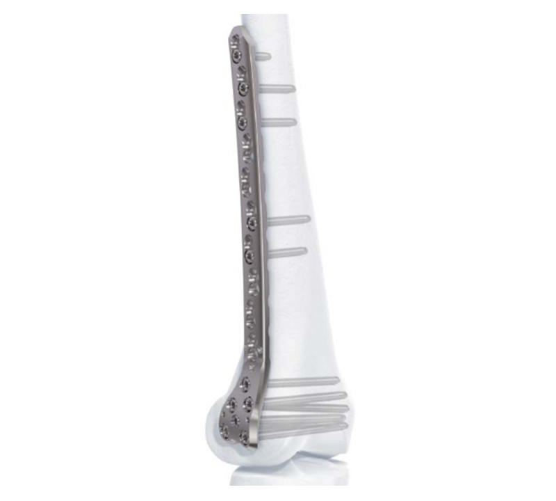 1. Smaller distal footprint with contoured edges to limit irritation of the iliotibial band. This smaller footprint was allowed by using all 5.0 mm screws in the head of the plate. The central 95° fixed-angle screw hole is still present to allow the surgeon to use the plate as a reduction tool.