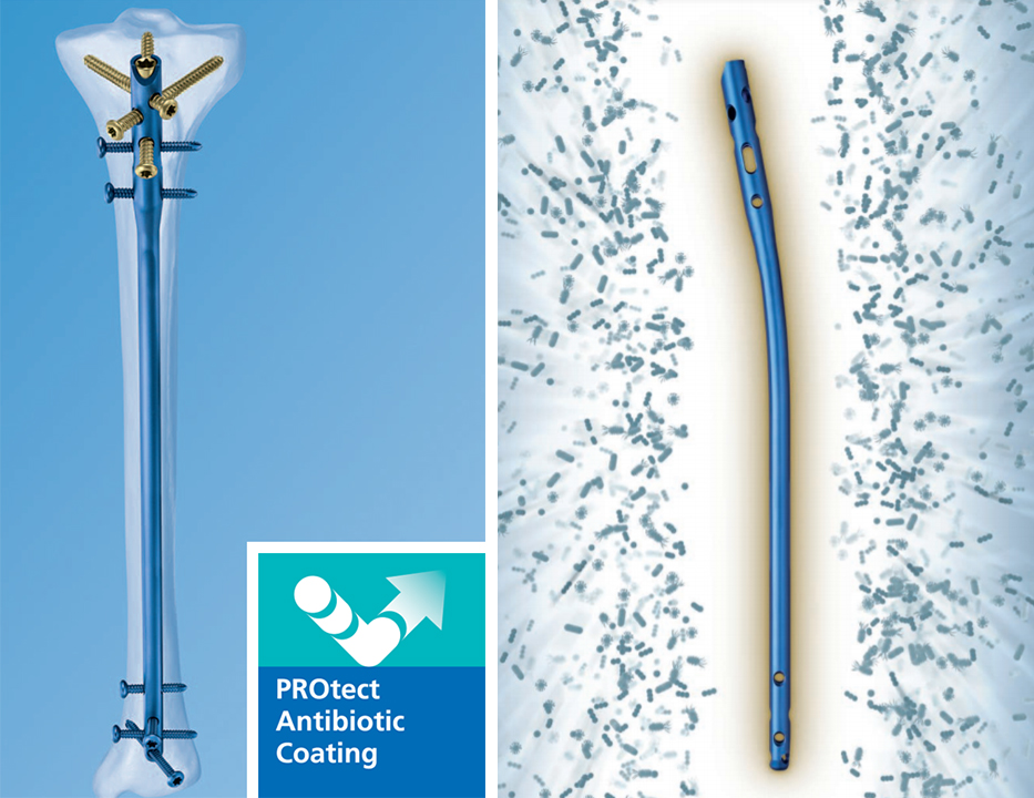 After coating, the implant is packaged and sterilized by gamma irradiation and delivered sterile to the clinics. The ETN PROtect can be used in extended indications, such as very proximal or very distal metaphyseal tibial fractures. In addition, the new implant may find its indication in revision surgeries or in patients where the immune system is compromised.