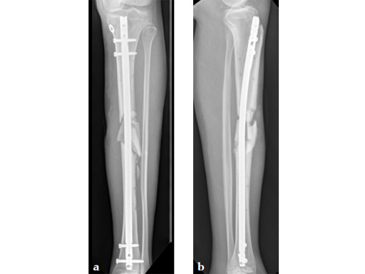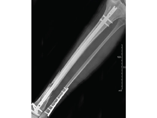 Case 1: A 33-year-old man with a third degree open fracture of his left tibia was initially treated with an external fixator and unilateral compartment release. He had undergone ACL reconstruction in the past.
